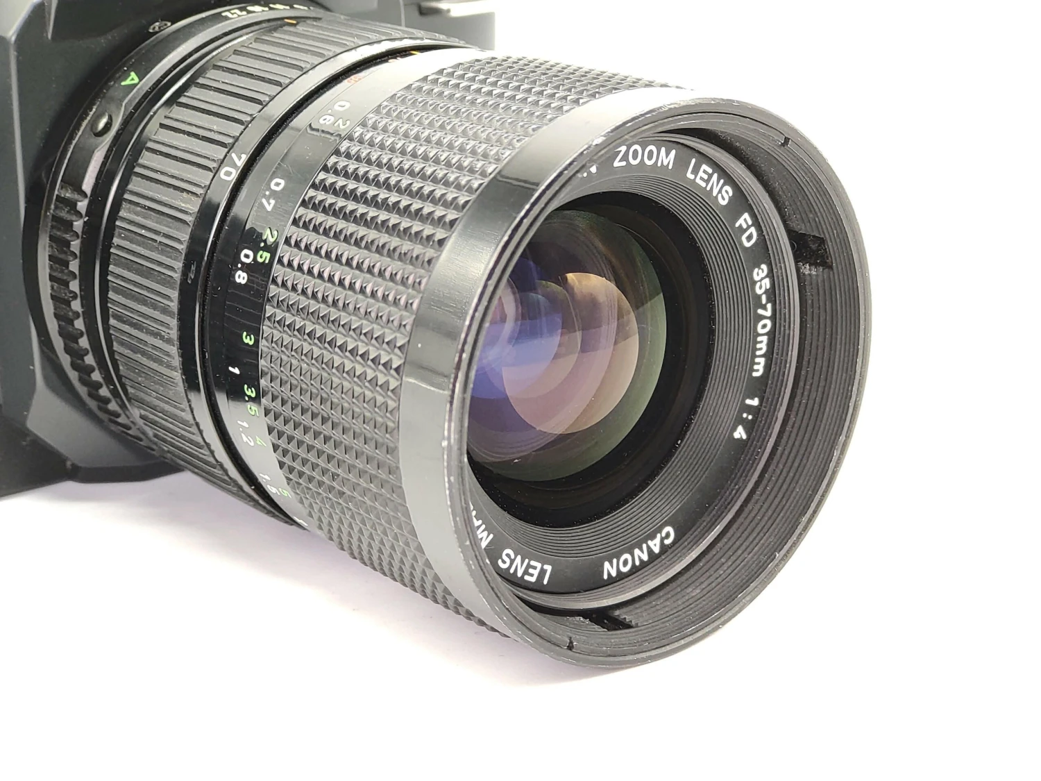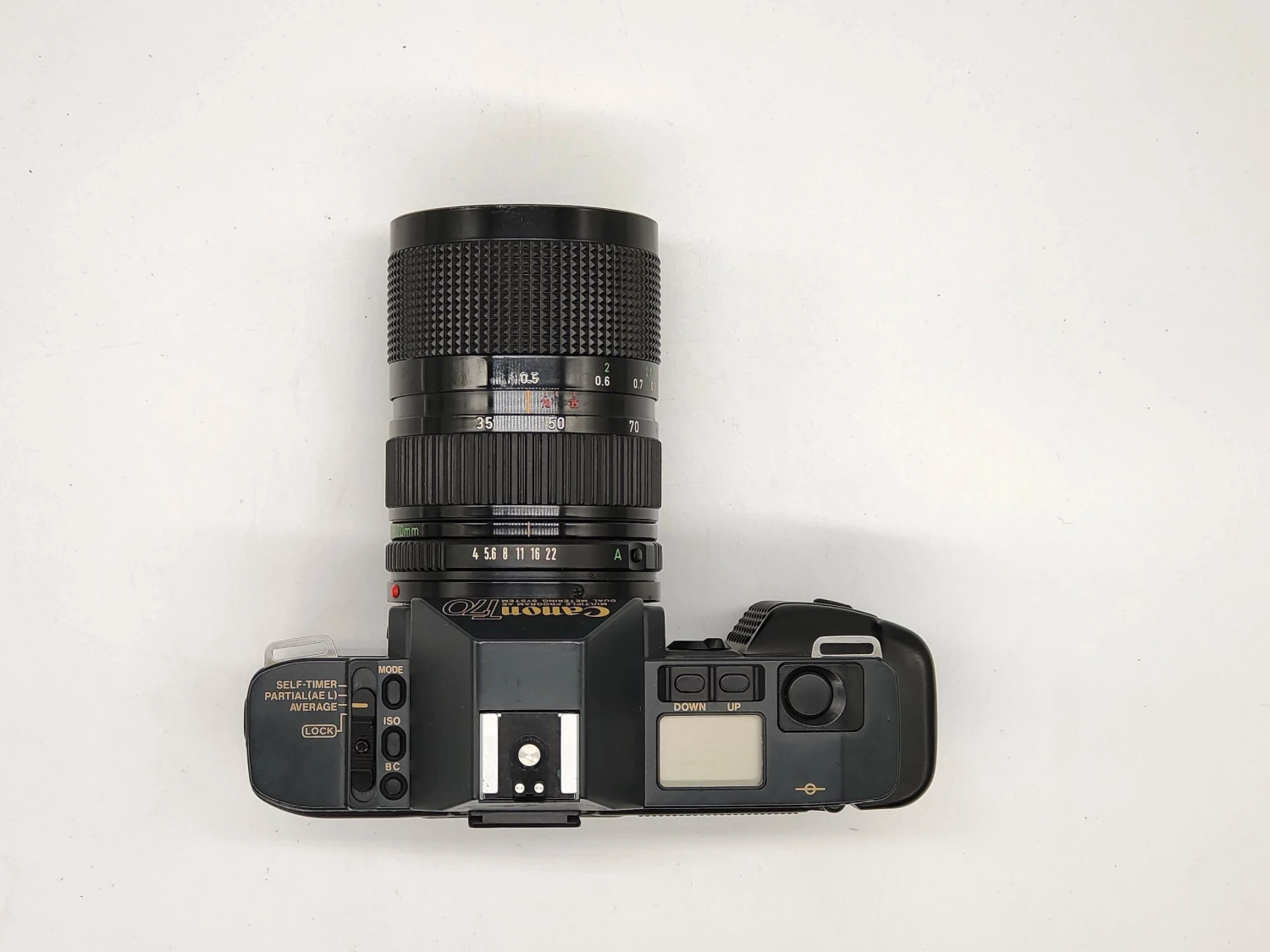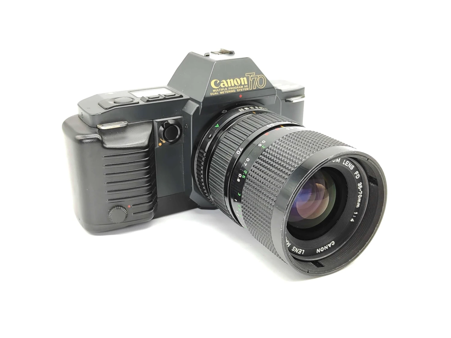 Introduced in 1984, the T70 has an onboard computer and a good set of features. It has motorized film winding and rewind, and Program Auto, Shutter Priority and Manual Exposure modes (comparable to the Canon AE-1 Program).