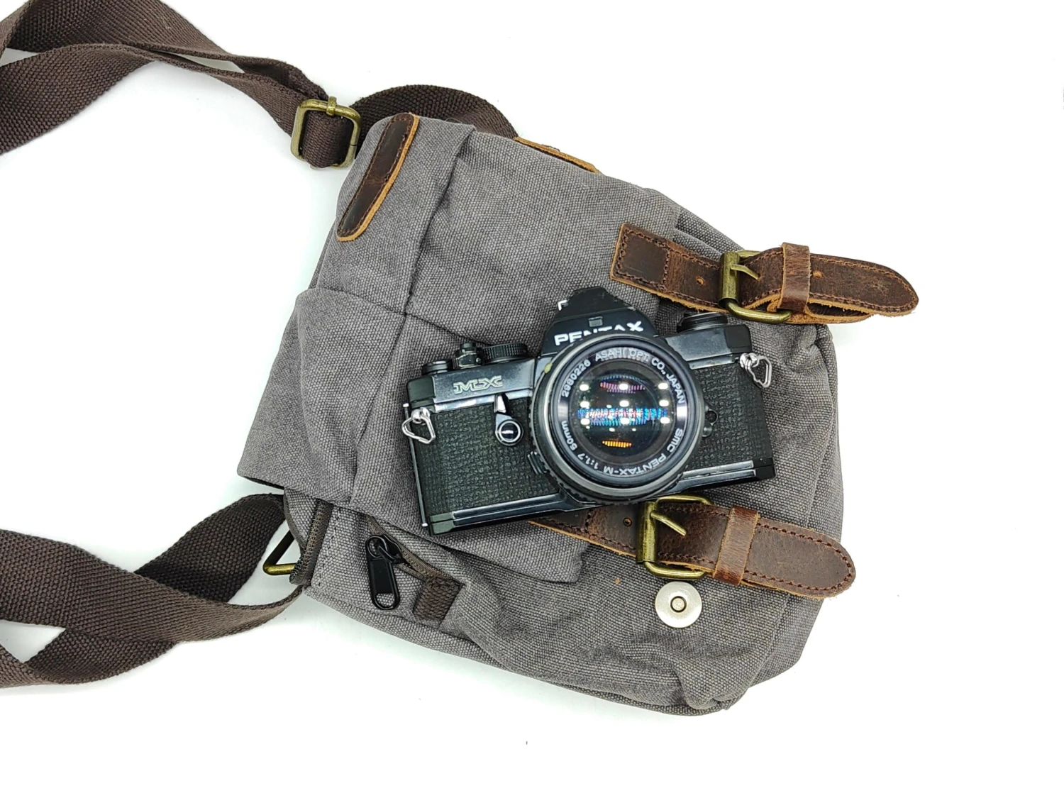 Nice small bag for a camera and a few accessories. Padded canvas, with magnetic double clasps. Adjustable strap, and dividers to keep items separate.