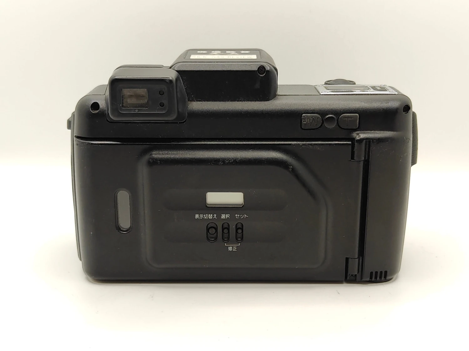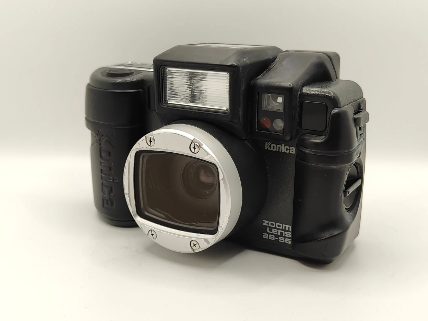 This is an unusual camera from Konica – built to withstand knocks and wet weather. Originally designed for use on construction sites, it has a body with rubberised coating to survive gentle drops, and a protective glass plate over the lens.