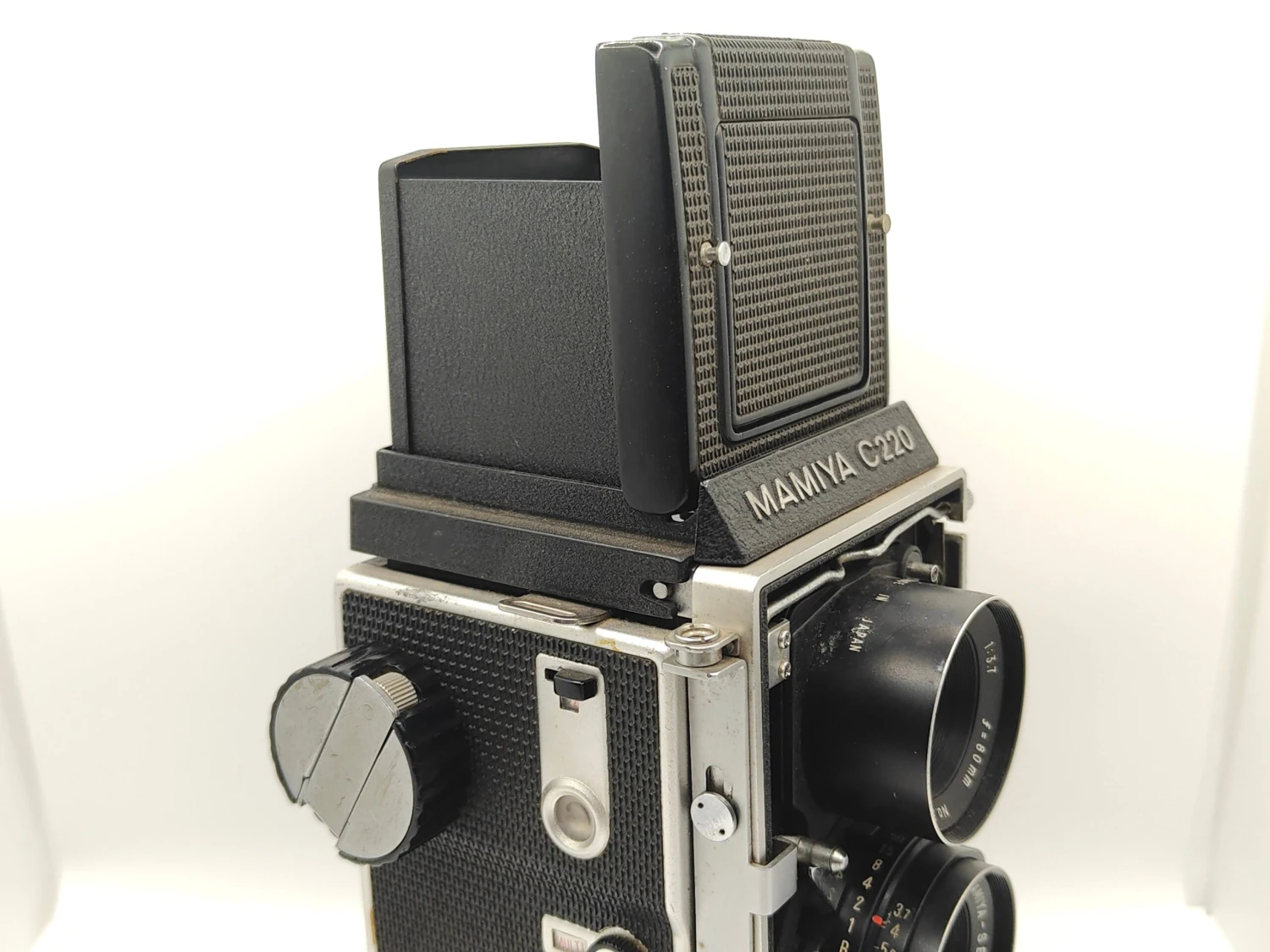 This is a nice example of the Mamiya C220 Professional twin-lens reflex medium format camera. In good condition overall. All controls work smoothly, and the bellows is in good condition with no light leaks.
