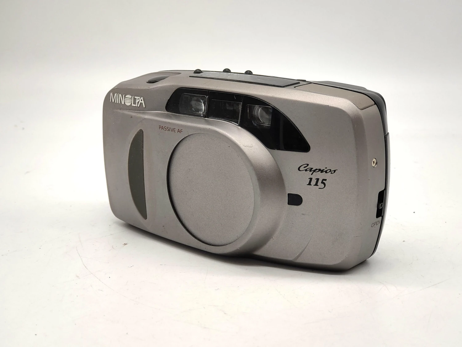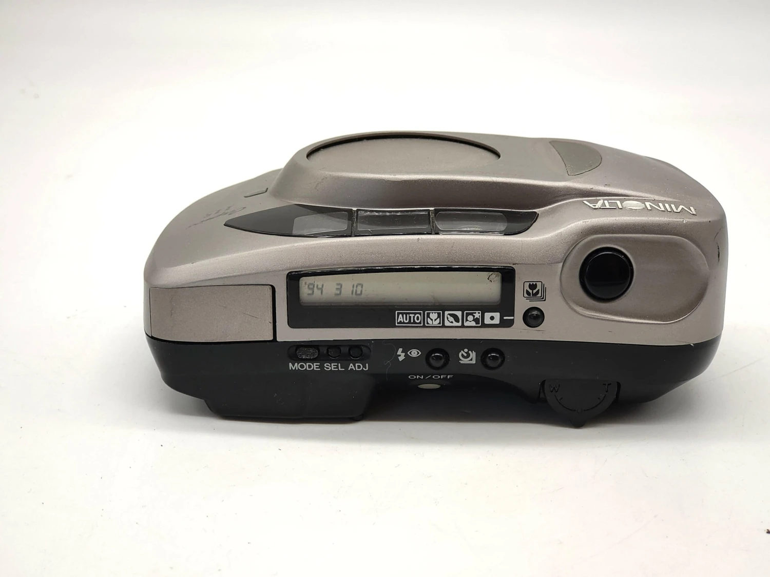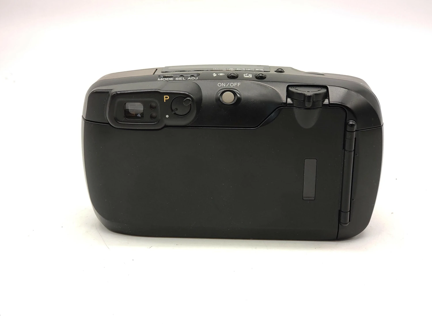 Has an LCD screen on top displaying the film counter, flash mode and battery status and a row of buttons for the camera controls.