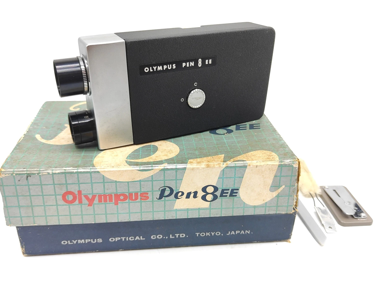 This is a nice example of an Olympus Pen 8mm camera in original box. Even comes with the original cleaning / splicing kit.